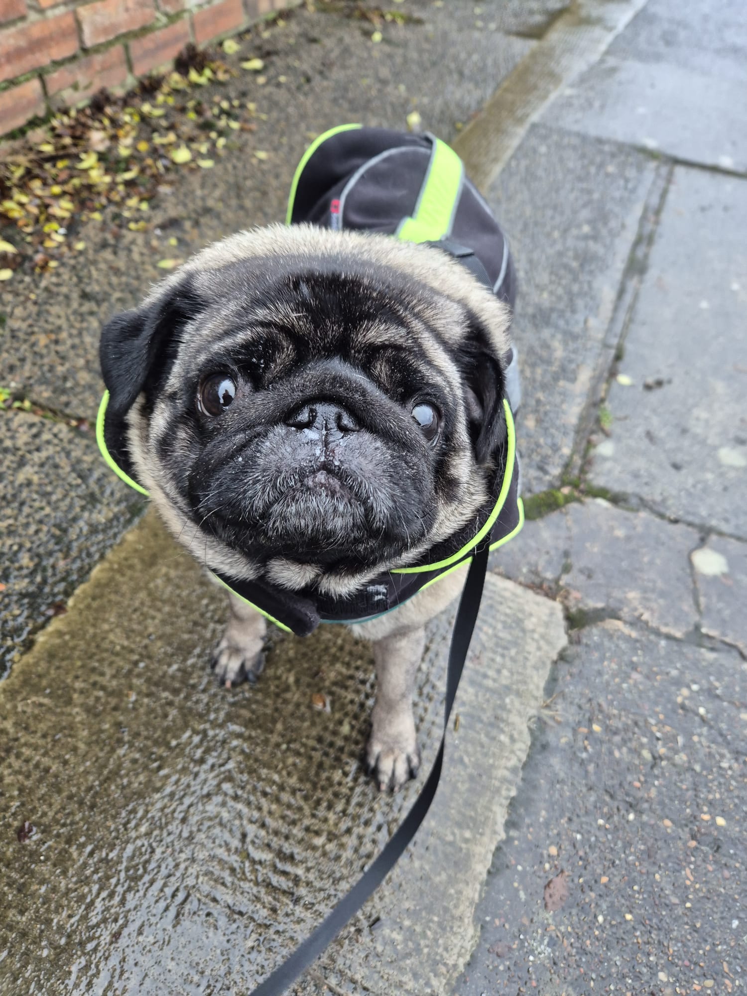 A soggy pug in a raincoat